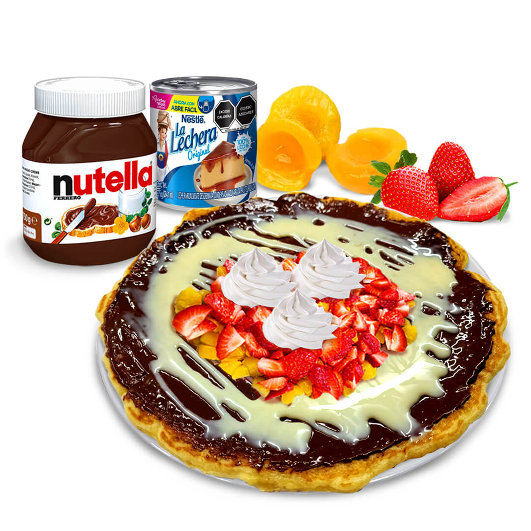 Hot Cake especial de Lechera, Nutella, Fresa, Durazno y Crema Batida